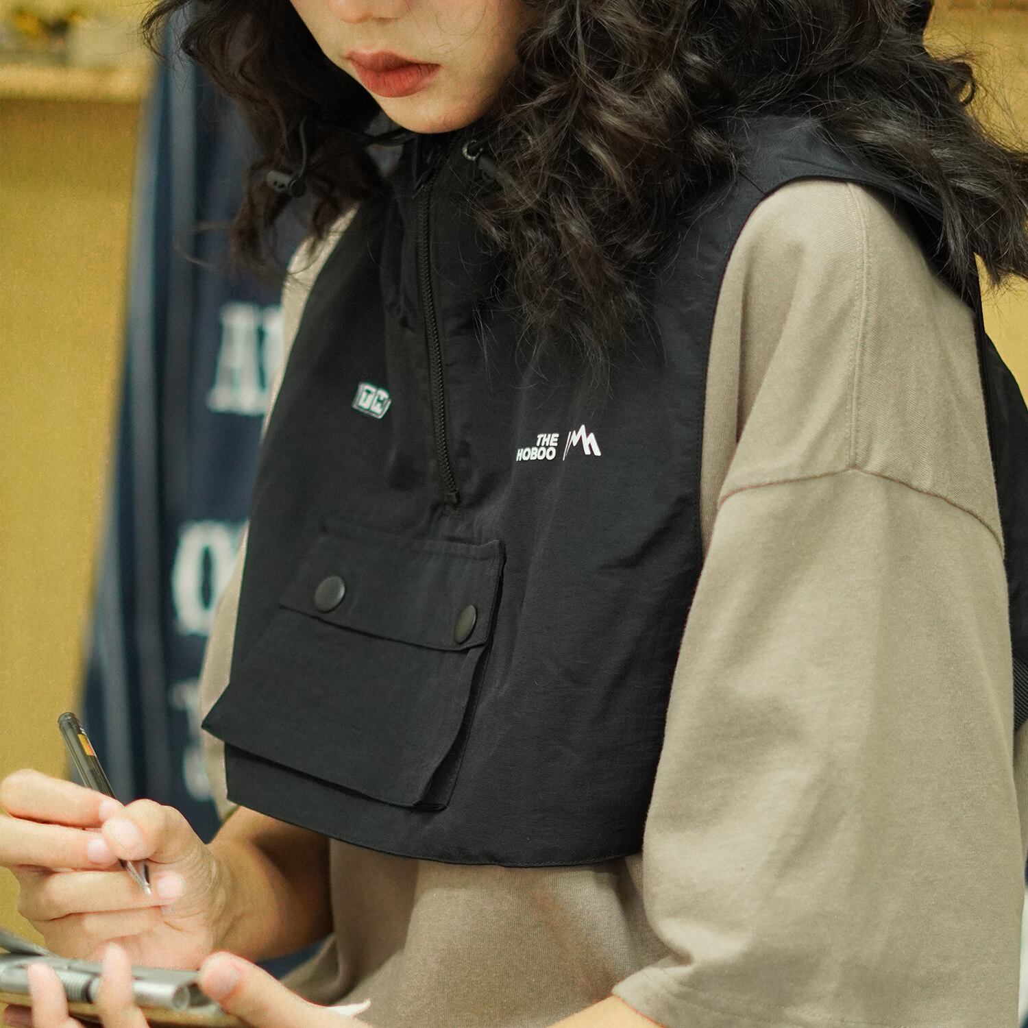 【THEHOBOO】ショートコートワークベストレディースサマーワンピースフード付きスタックベストメンズファッション 夏物 hat45293504009